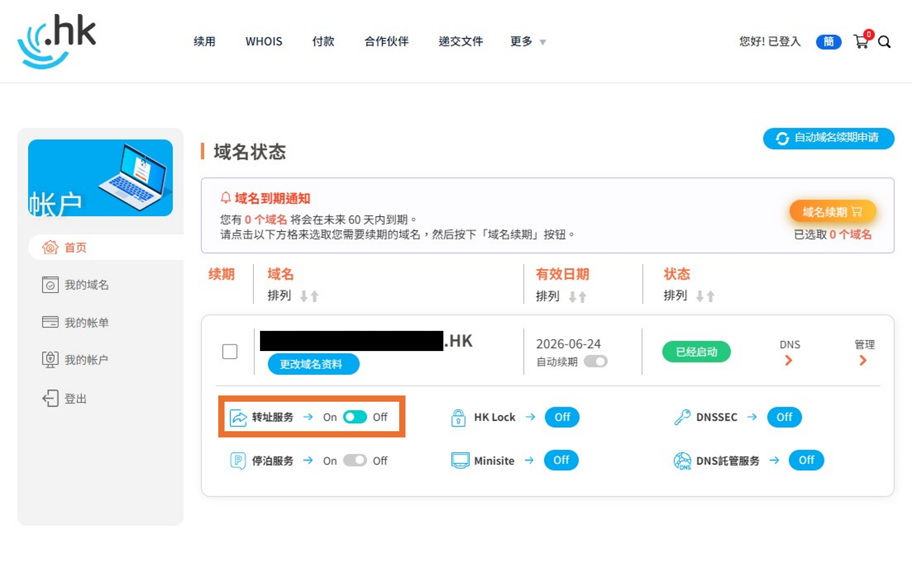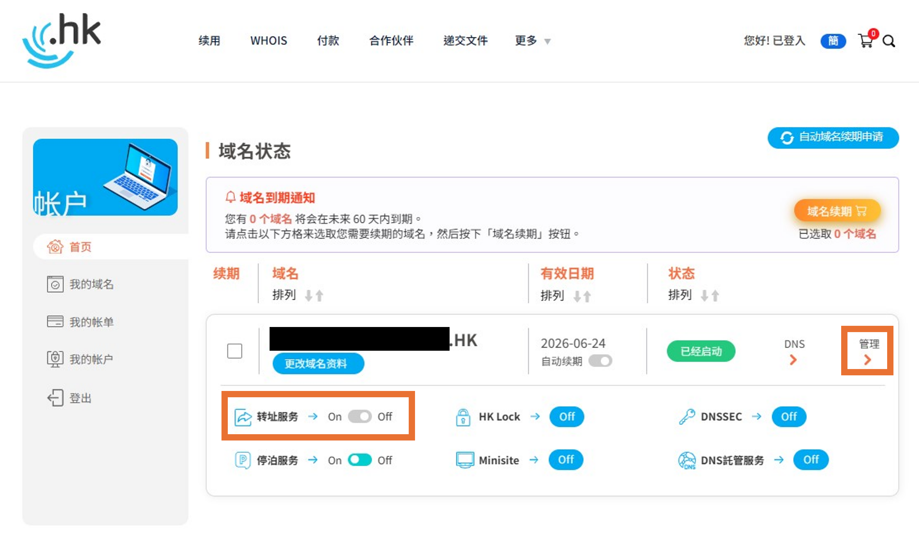第 1 步:请登录您的帐户 第 2 步:在您选择的域中点击“管理”,然后点击开启“转址服务” 第 3 步:输入您指定的网站,然后确认 第 4步:完成开启“转址服务”